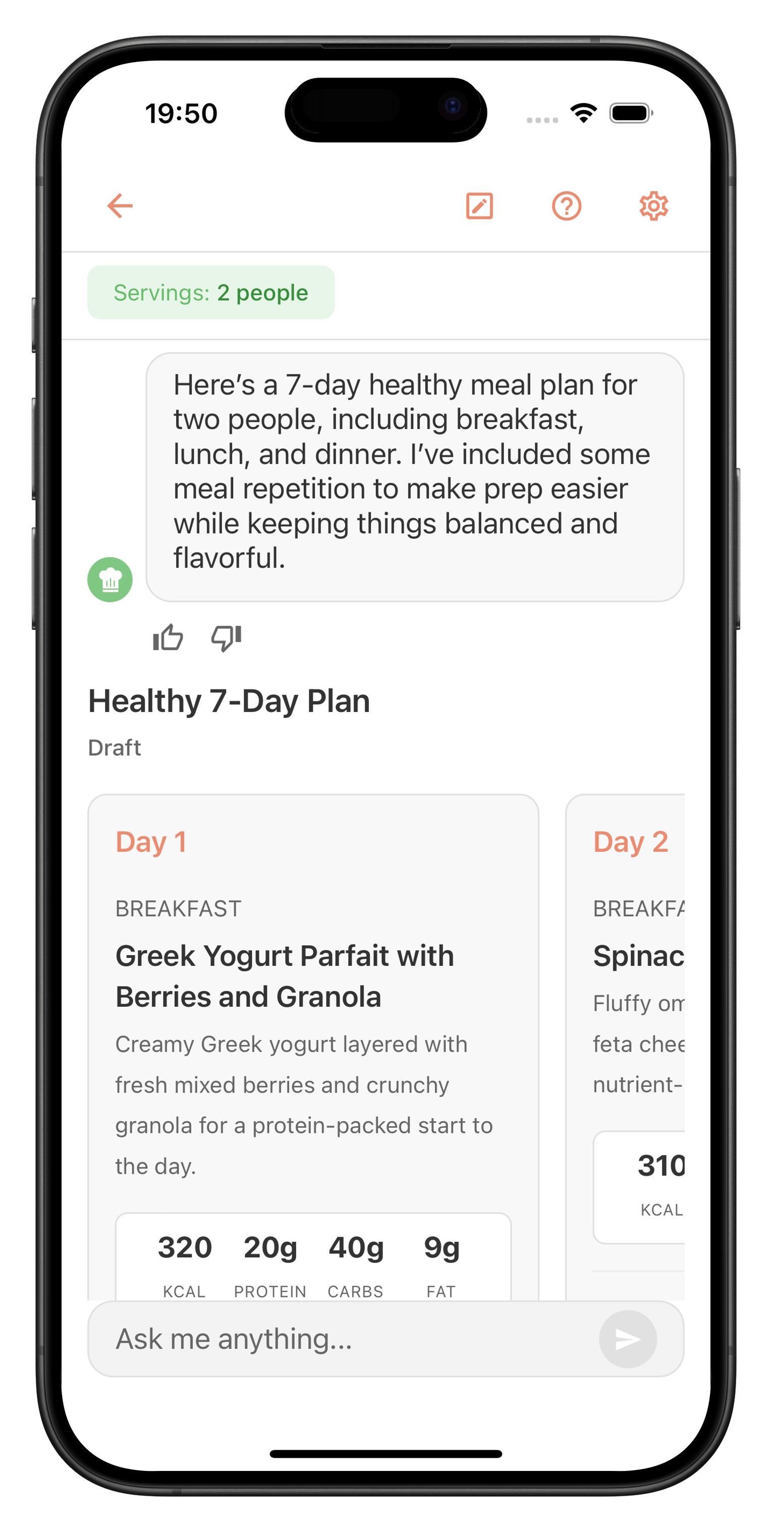 Get personalised recipes tailored to your preferences, cooking advice, or ask for complete meal plans for the week.
